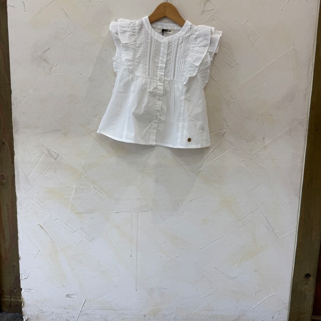 とても柔らかな綿素材のブラウスです。 大きなフリルと前の部分の透かし、ピンタック使いがとてもオシャレ!! ゆるやかなAラインなのでアウトで着ても可愛いです♡ 綿100% 80-140cm ¥3190 150.160cm ¥3960