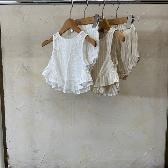 ラウンドフリルヘムが可愛い、ノースリーブチュニックset。 コットンレースと先染めストライプの2素材は、清涼感のある透かし素材。 SET UPでも単品でも着回せる、1枚あると便利なアイテム。 上下setでギフトにもオススメ。 ホワイト⇨綿100% ストライプ⇨綿70%ポリエステル30% 70.80cm ¥4620
