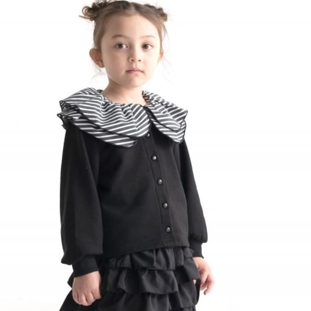 2025AW maarook 裏毛フリル衿カーディガン 105-5117011 着用いただきやすい裏毛素材のカーディガンです。 フリルの衿がポイントです。 モノトーンのストライプがモードでキュートな雰囲気に カーディガンとしての着用も、前のボタンを閉めてインナー使いにも重宝する1枚です。 これ一枚を合わせるだけで華やかにコーディネートを仕上げてくれます。 本体 ポリエステル65% 綿35% 衿 綿70% ナイロン27%ポリウレタン3% リブ 綿 95%ポリウレタン5% 80-130cm 税込7590円 140-160cm 税込8690円