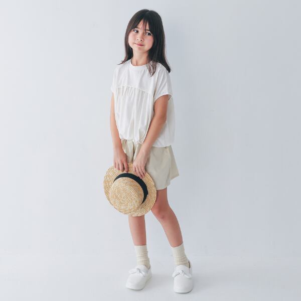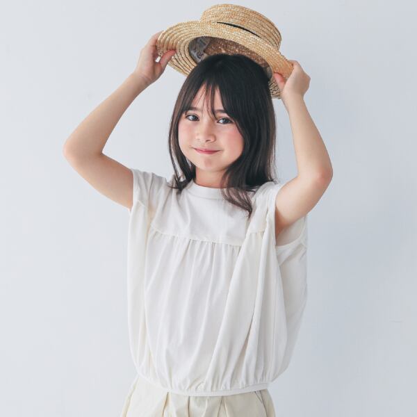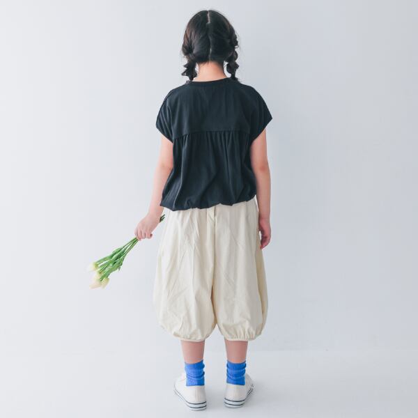 ギャザーによるバルーンシルエットが可愛いTシャツです。