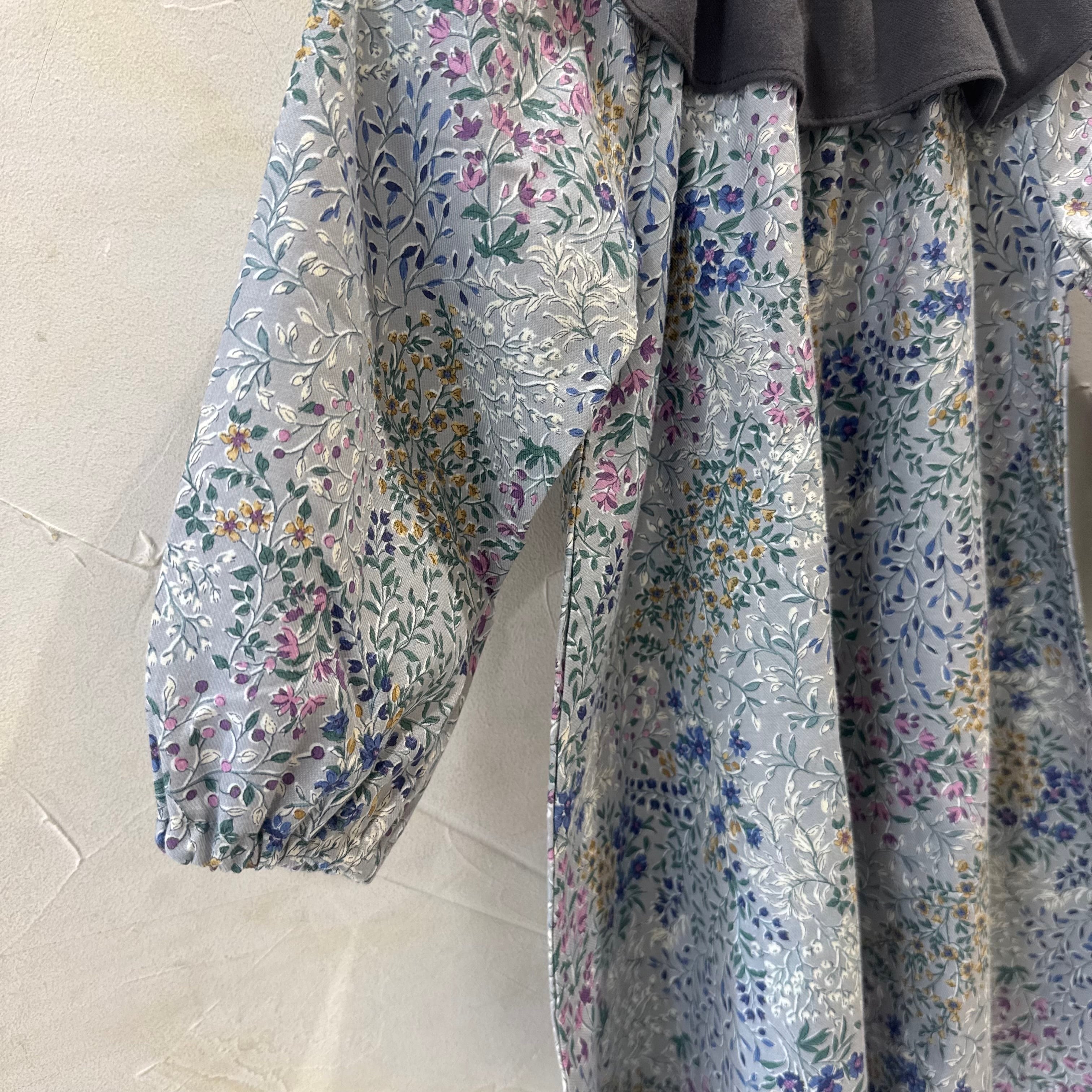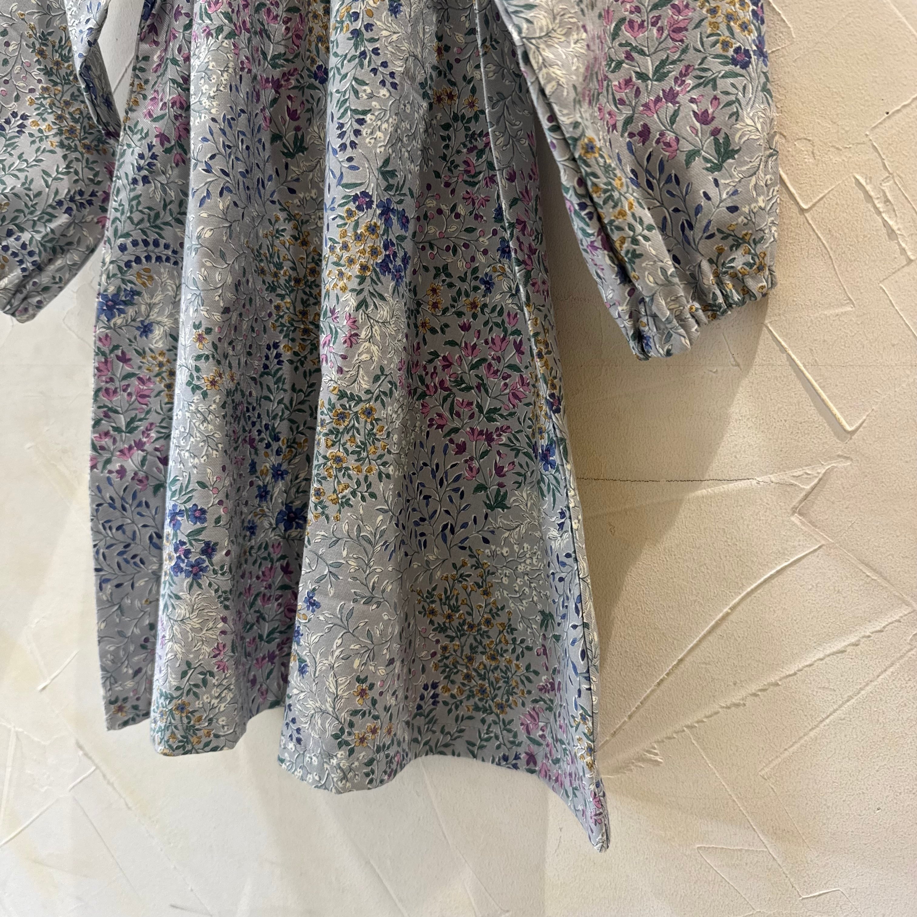 グレーの生地に品のあるボタニカルデザインのAラインのワンピースです。