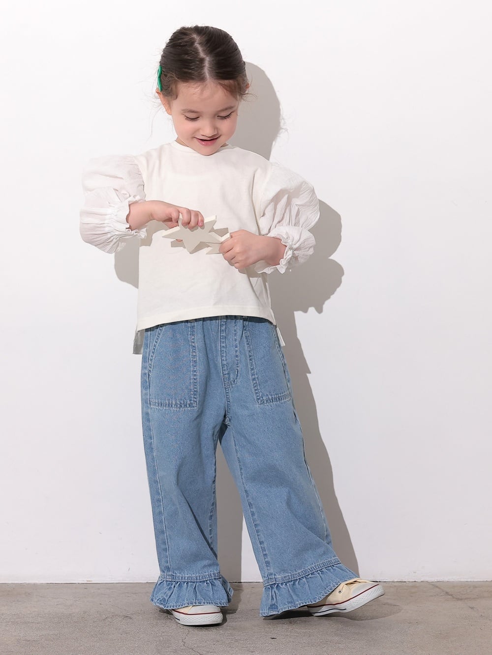 ほんのり透け感のある、異素材使いのボリュームパフスリーブがガーリーデザインな、長袖Tシャツ