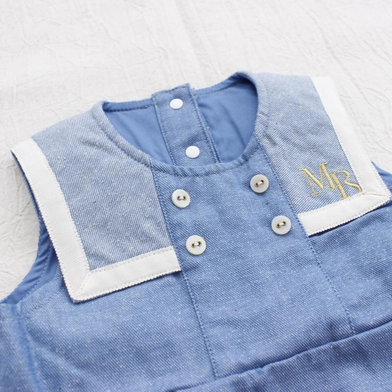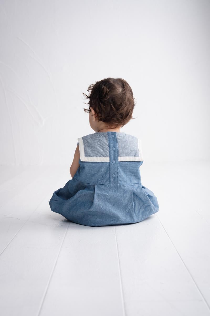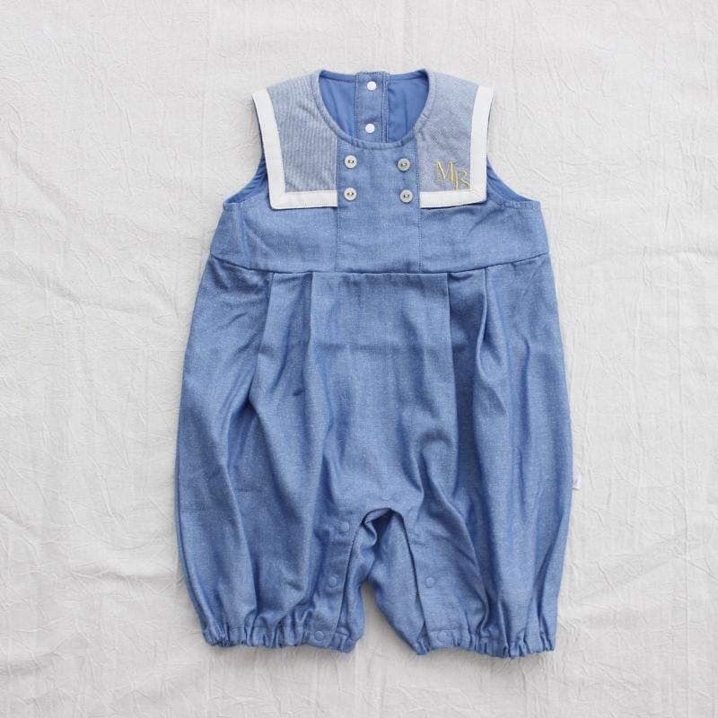 ブルーカラーが爽やかなネップデニムのbabyロンパースです。