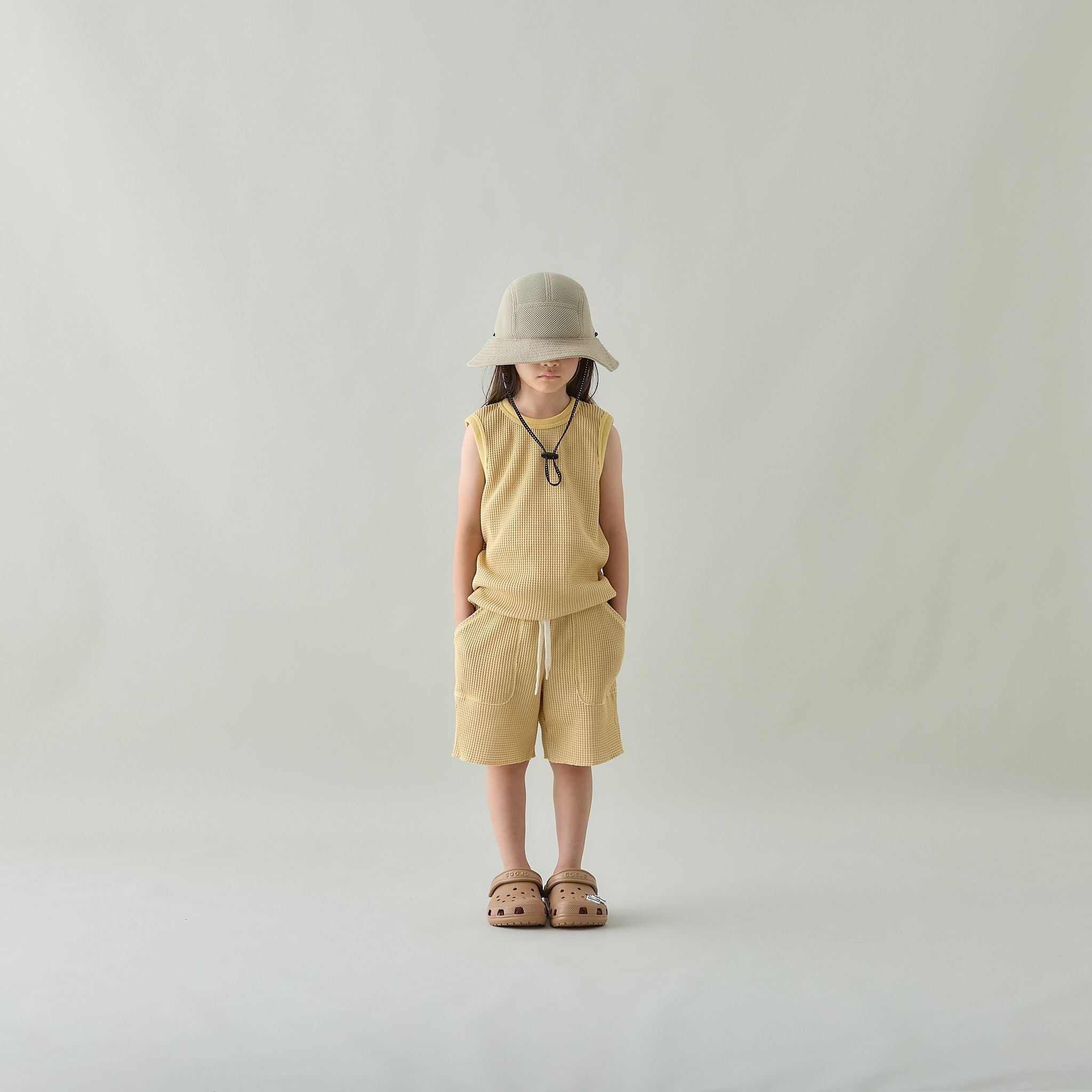 バイカラー(2配色)で作った、細かいチェック柄の様に見える新鮮な印象のオリジナルのワッフル素材を使用。