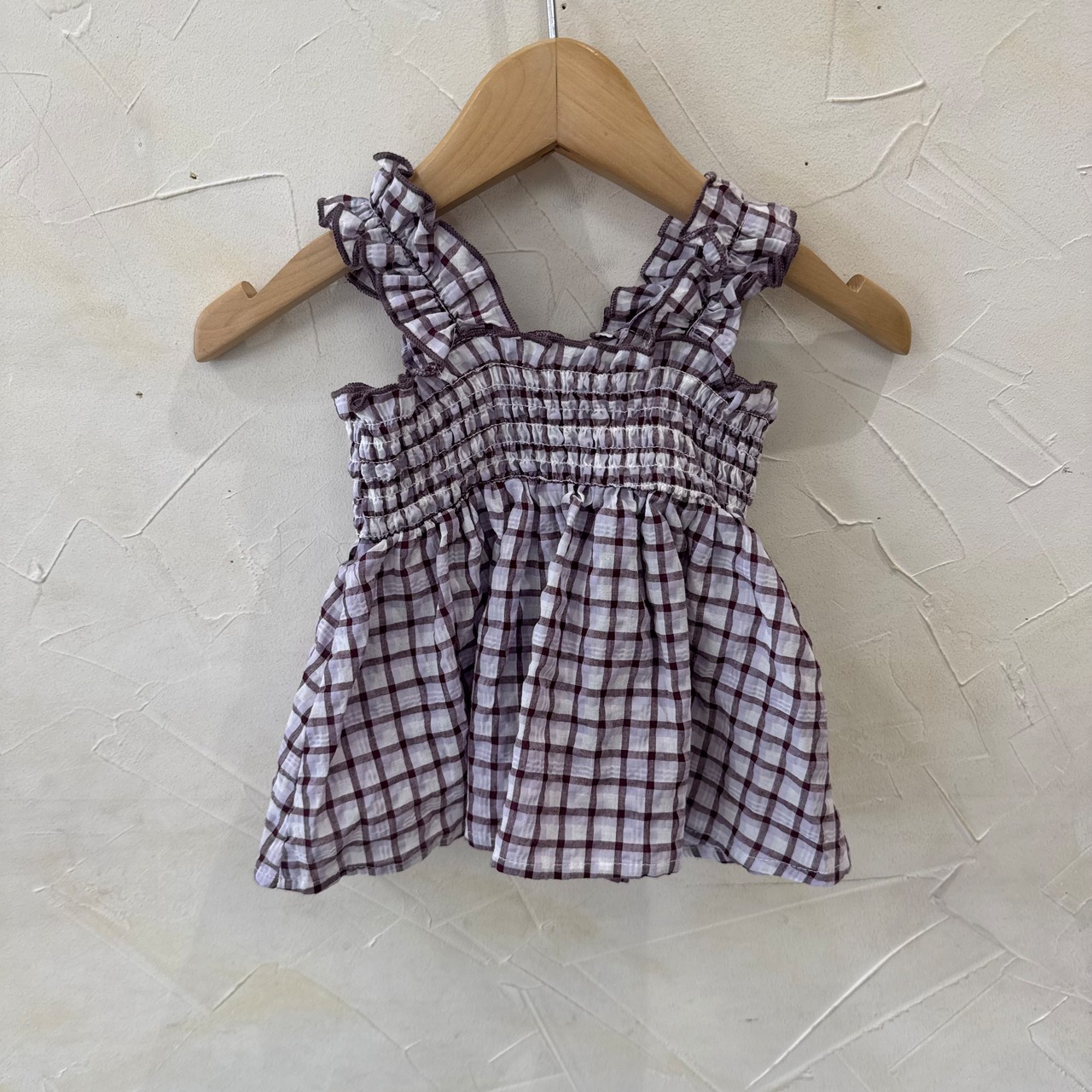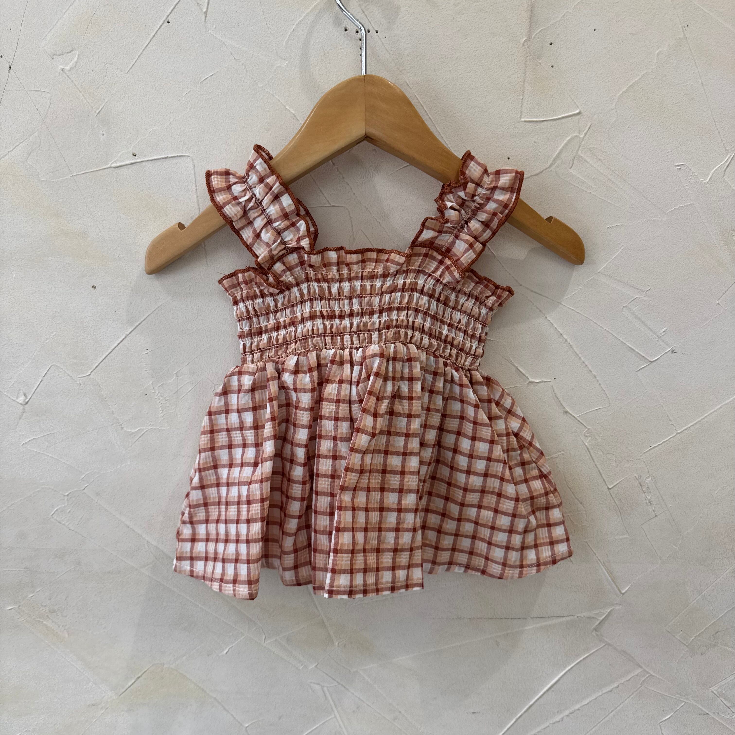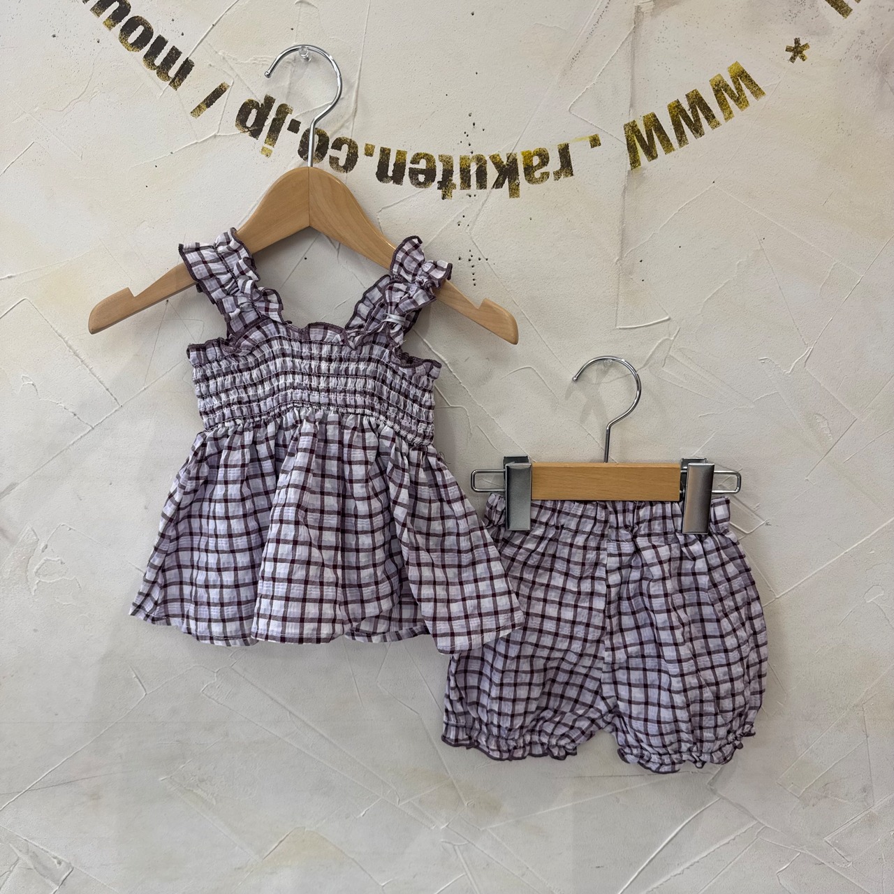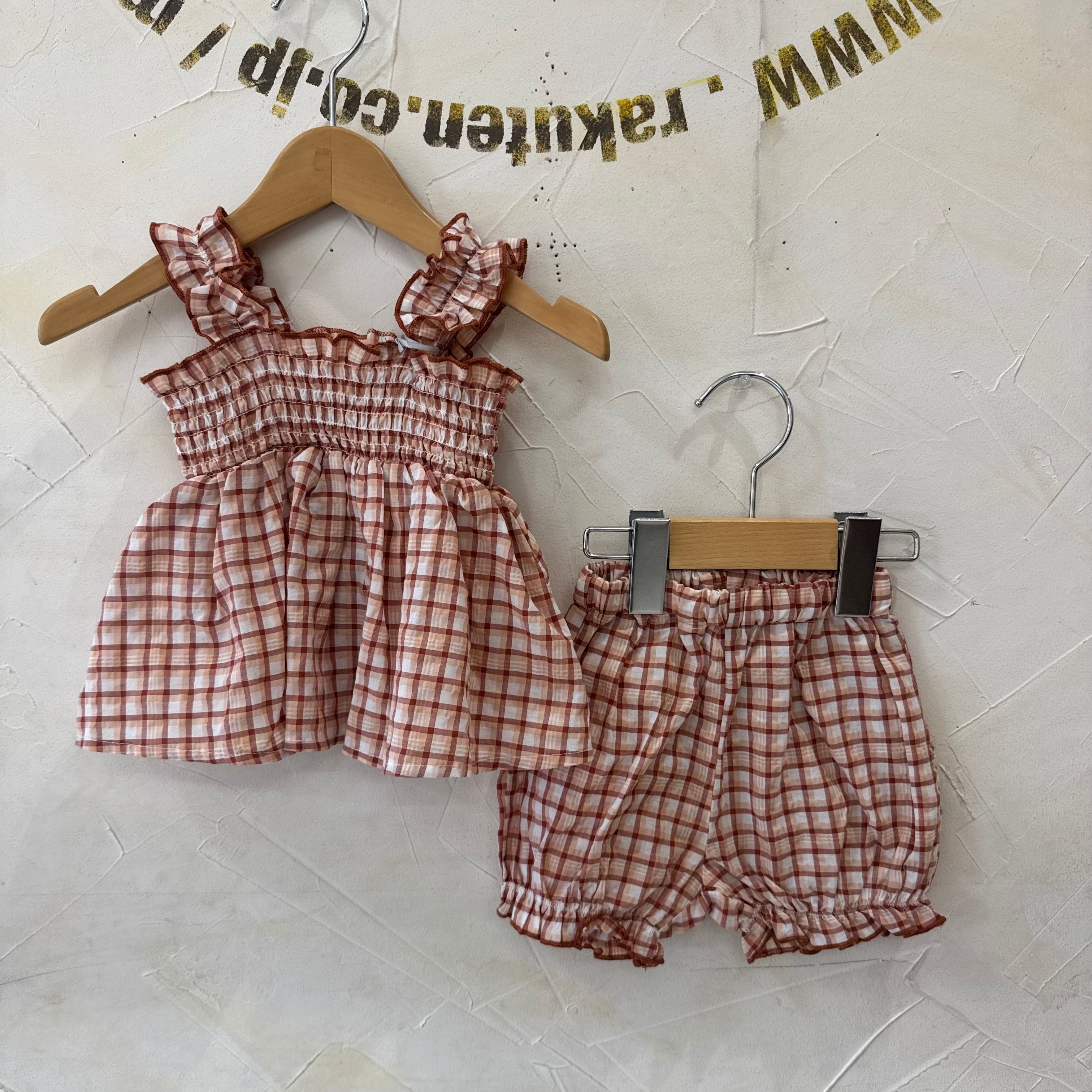 涼しげなチェック生地のチュニックとボトムのセット。