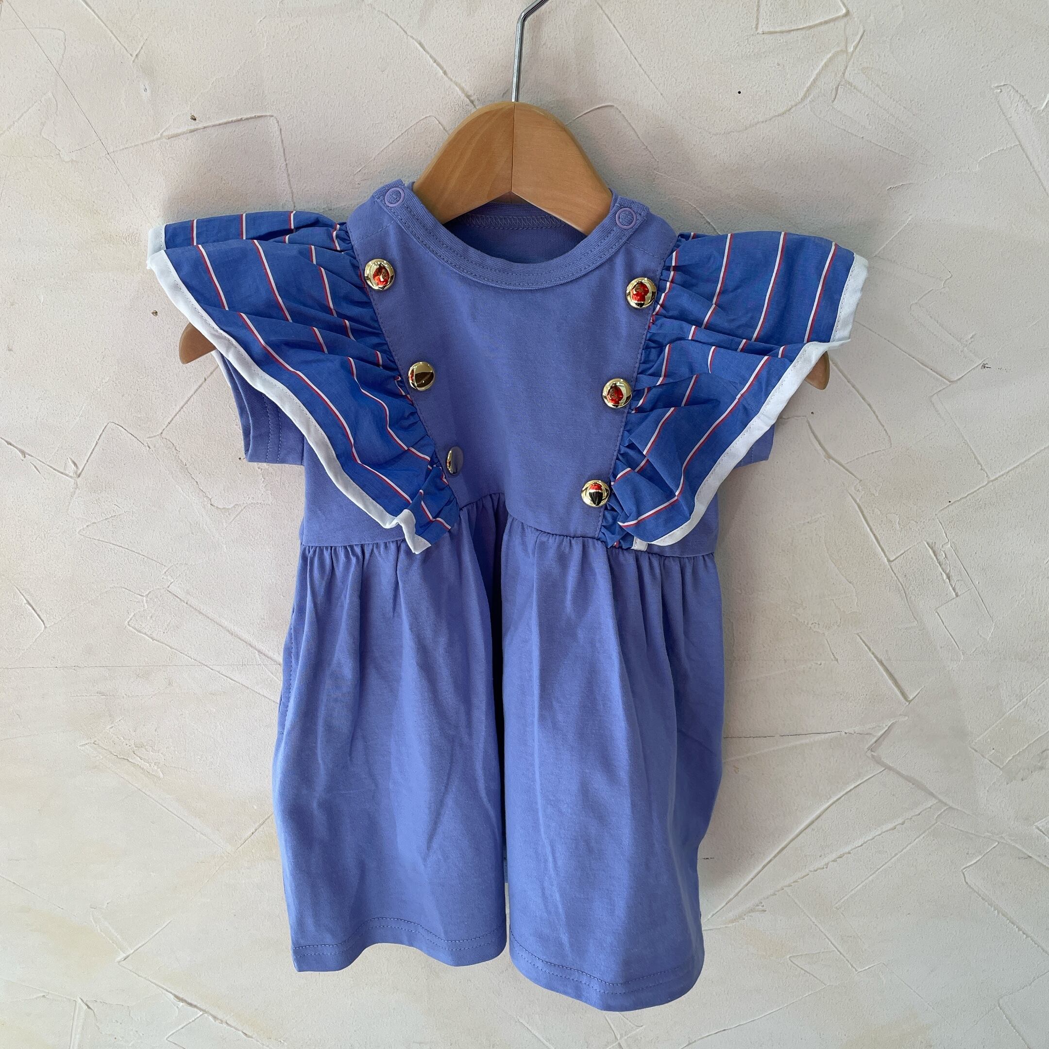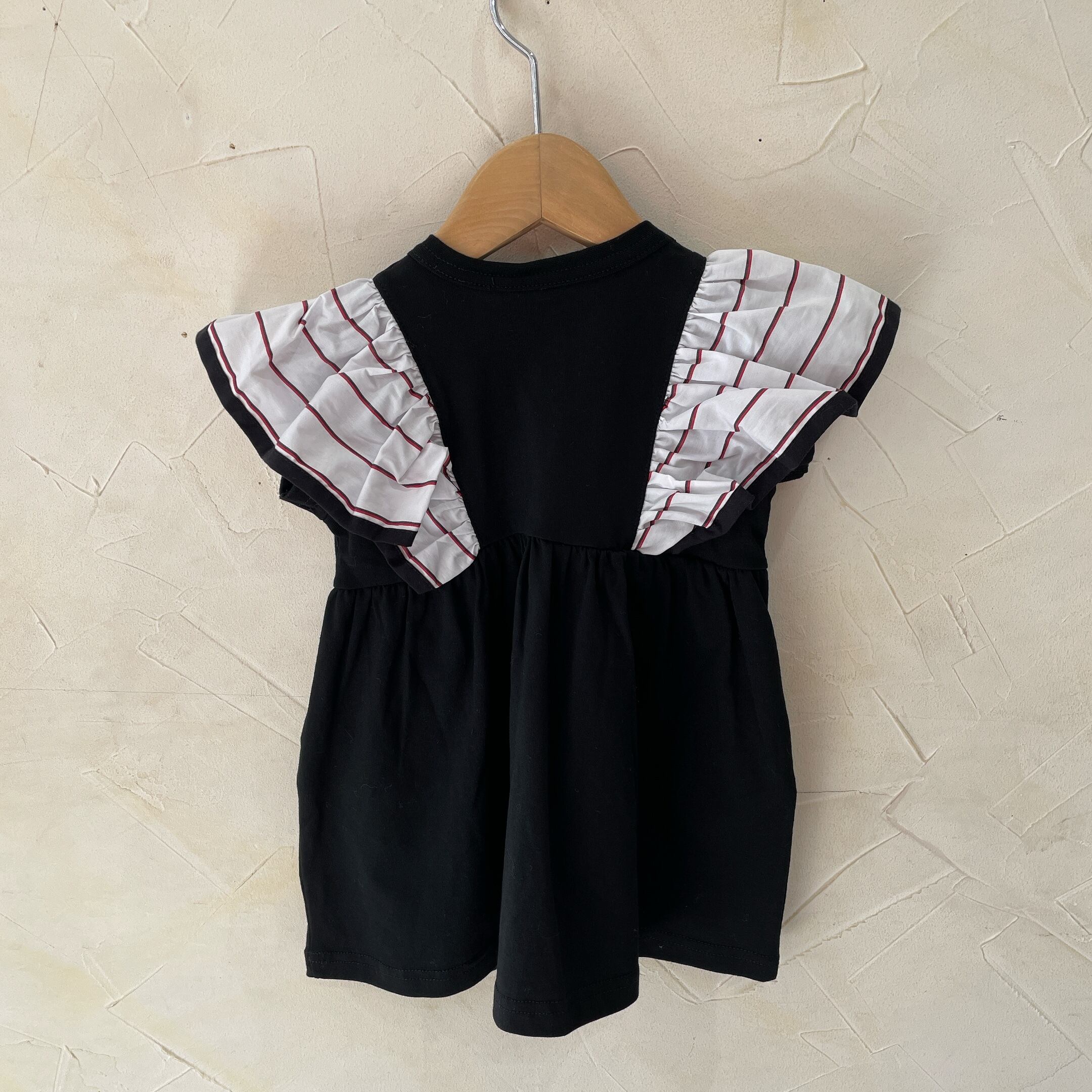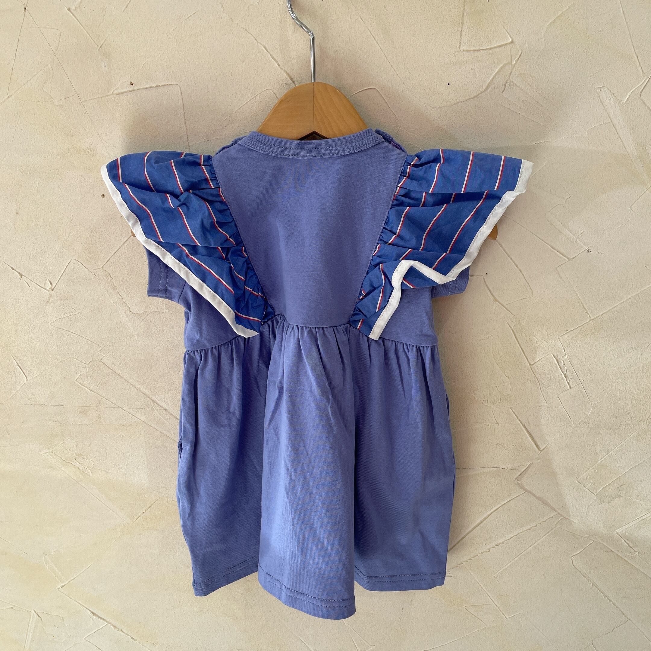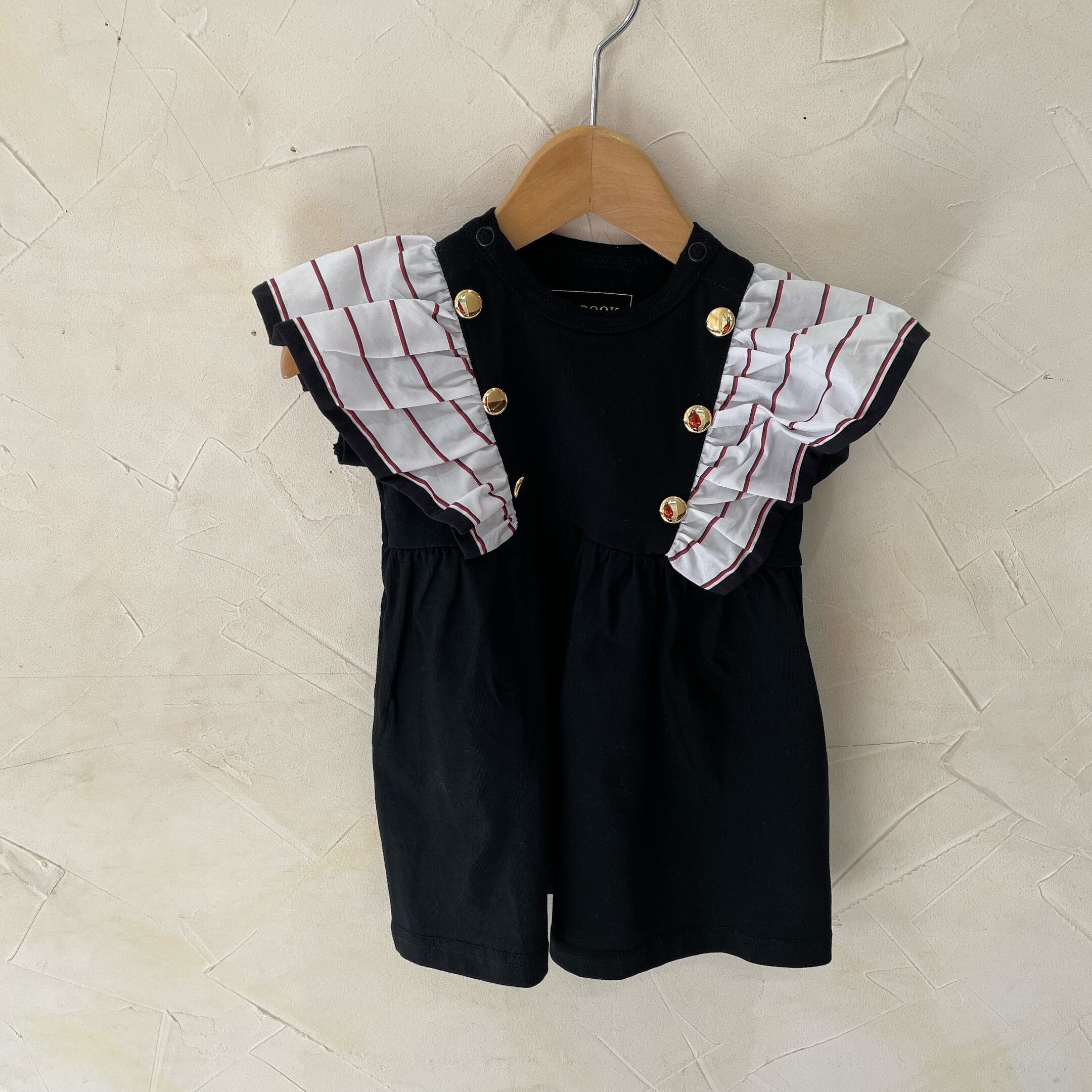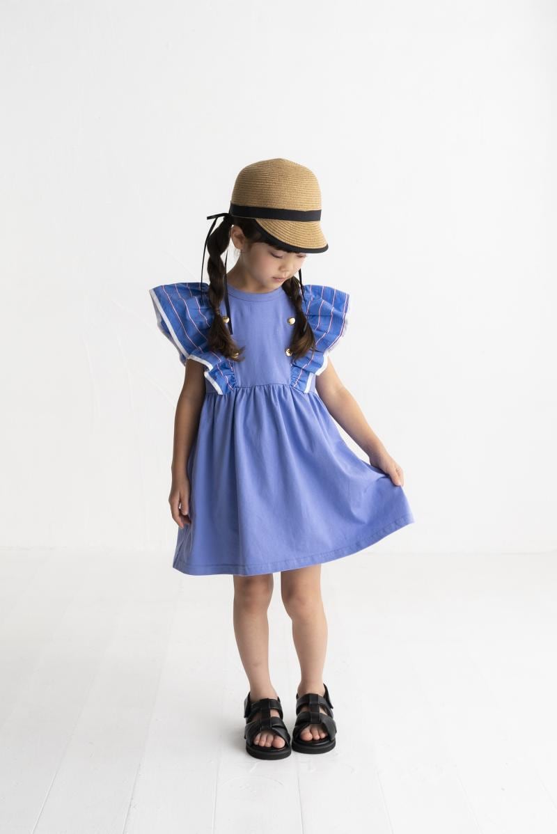 パイピングの効いたストライプのフリルのお袖が印象的なワンピースです。